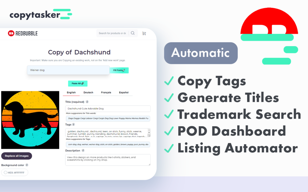 Copytasker Automatic for Redbubble gets all the Top Tags for any Redbubble keyword, Generates a Title, and fills out your listings for you!
