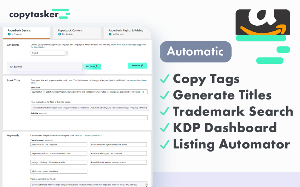 Copytasker for Kdp gets all the top tags for any Kdp keyword. Bonus: it also Generates a Title for you and has a Trademark searcher!